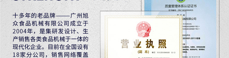 廣州旭眾食品機(jī)械有限公司是一家集科研開發(fā),生產(chǎn)設(shè)計(jì),營(yíng)銷服務(wù)為一體的現(xiàn)代化生產(chǎn)企業(yè)。現(xiàn)代化生產(chǎn)車間,精湛制造技術(shù),所產(chǎn)機(jī)械歷經(jīng)市場(chǎng)重重考驗(yàn),不斷贏得海內(nèi)外客戶的贊譽(yù)。