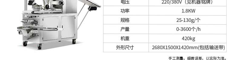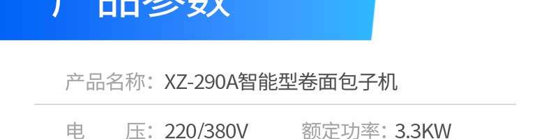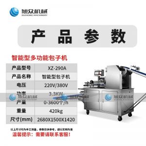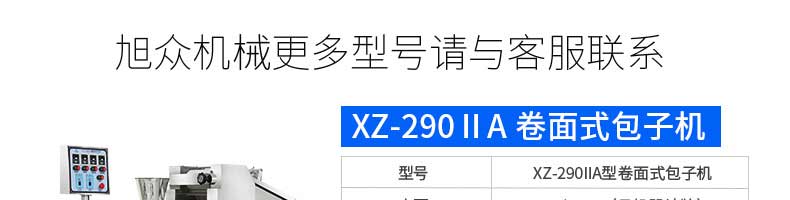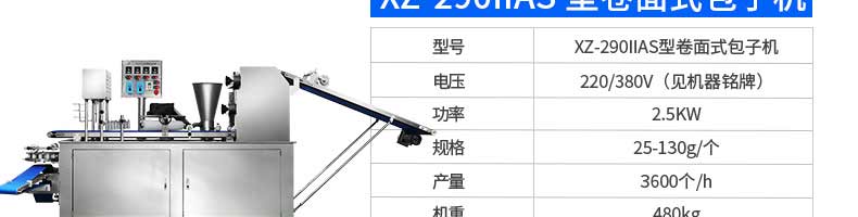 名稱XZ-290A智能卷式包子機 電源220/380v 功率3.3kw 產(chǎn)量0-36000個/h 尺寸2680*1500*1420mm 重量420kg 規(guī)格 其他
