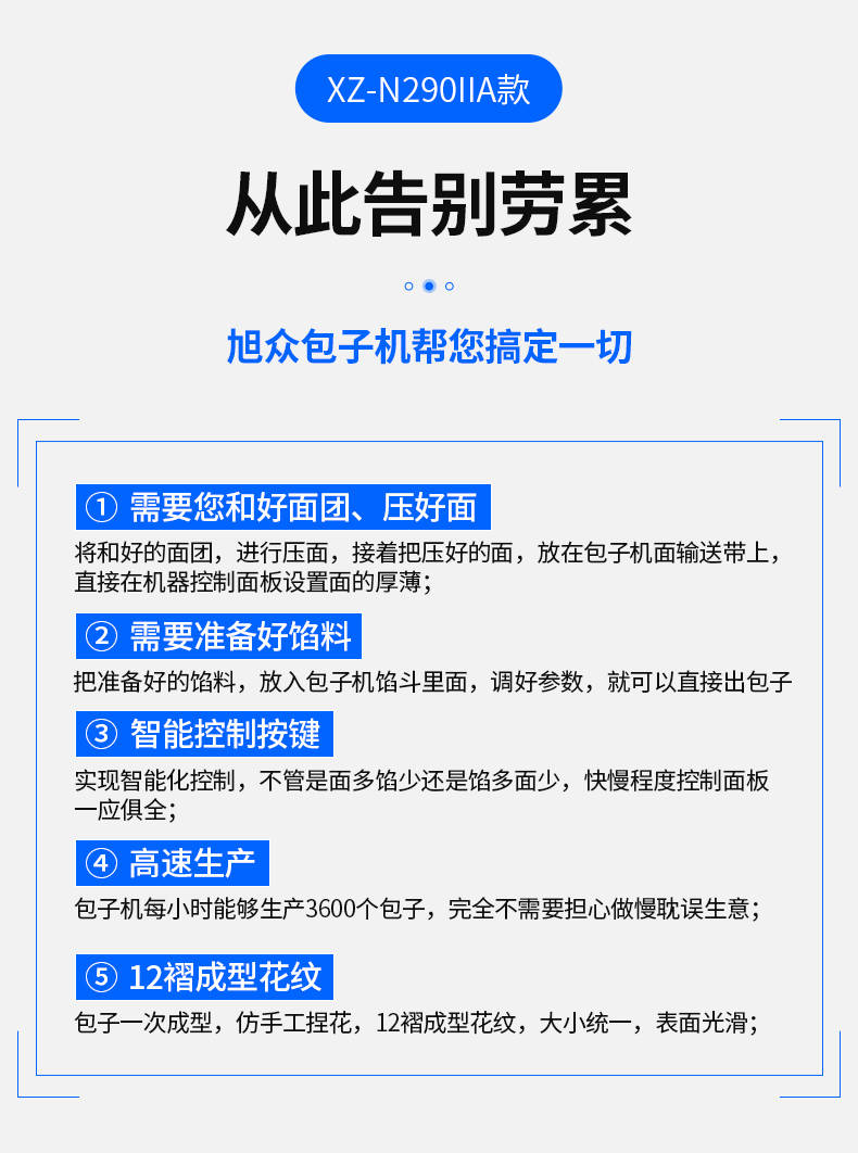 名稱XZ-N290IIA卷面式包子機(jī) 電源220/380V 功率1.8KW 產(chǎn)量3600個/h 尺寸2680X1500X1420mm(包括輸送帶) 重量430k 規(guī)格25-130g/個 其他
