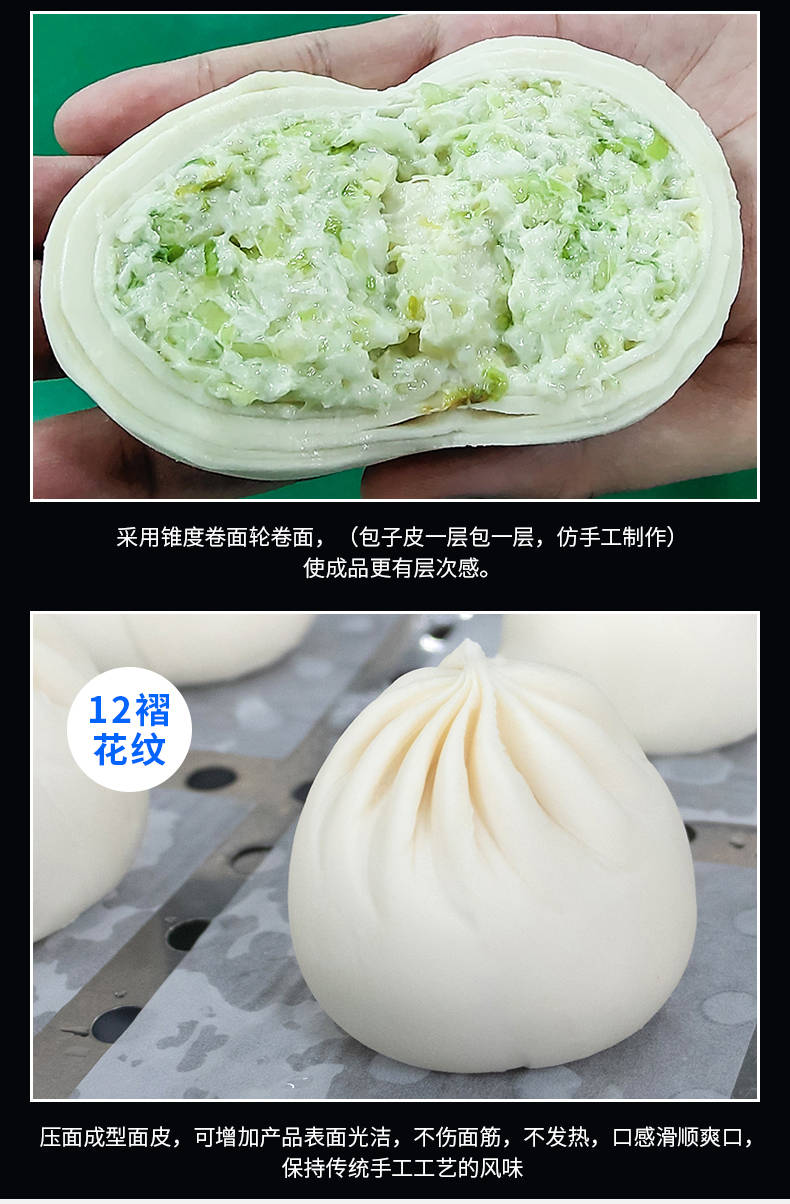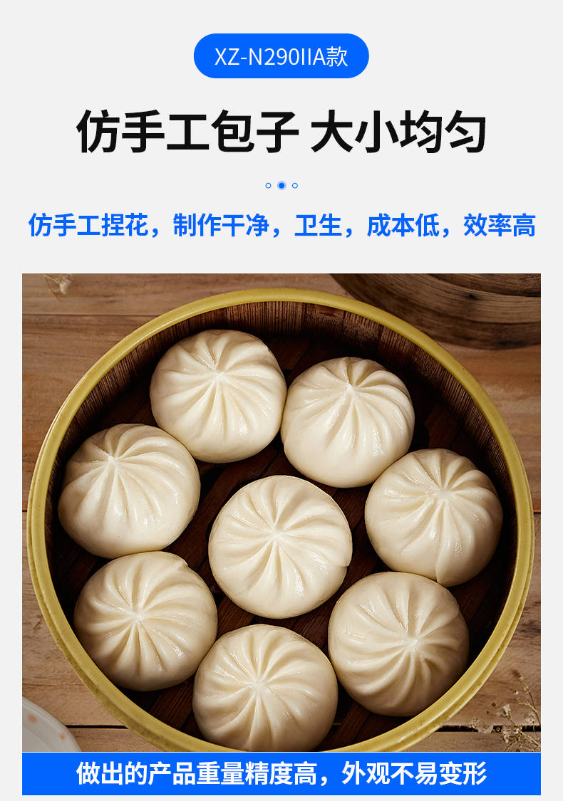 XZ-N290IIA卷面式包子機(jī),壓面成型面皮,卷面方式包餡。仿手工捏花、一次成型、表面光滑、口感勁道。面餡可調(diào)、制品多樣。產(chǎn)品重量精度高,規(guī)格,大小,面皮的厚度皆可調(diào)控。