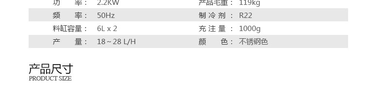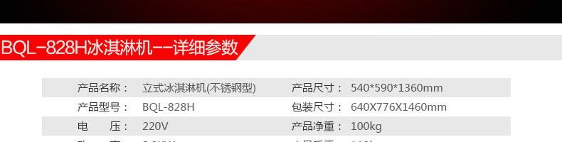 名稱(chēng)BQL-828H立式冰淇淋機(jī) 電源220V 功率2.2kw 產(chǎn)量18-28L/h 尺寸540*590*1360mm 重量119kg 規(guī)格 其他