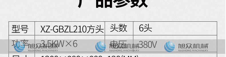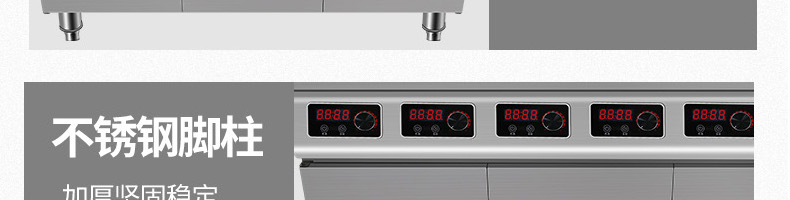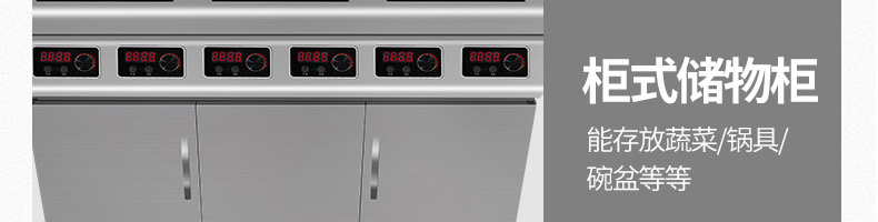 名稱XZ-GBZL210方形柜式電磁爐 電源380V 功率3.5KW×6 產(chǎn)量聯(lián)系銷(xiāo)售員 尺寸1200×800×800+120MM 重量聯(lián)系銷(xiāo)售員 規(guī)格頭數(shù):6頭 其他