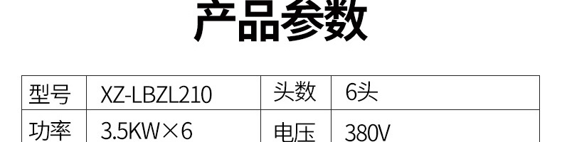 名稱XZ-LBZL210圓頭六頭電陶爐 電源380V 功率3.5KW*6 產(chǎn)量聯(lián)系銷售員 尺寸1200×800×800+120MM 重量聯(lián)系銷售員 規(guī)格頭數(shù):6頭 其他