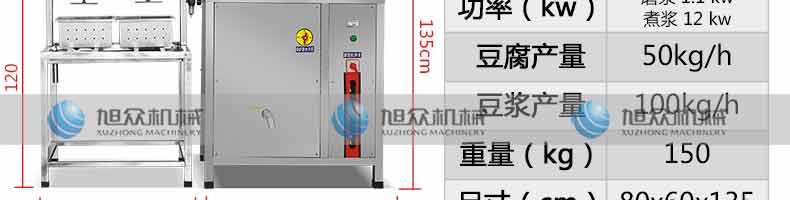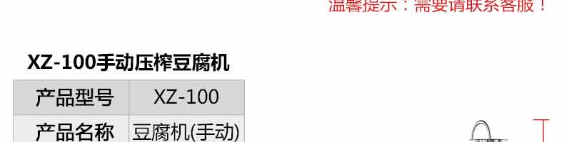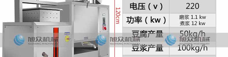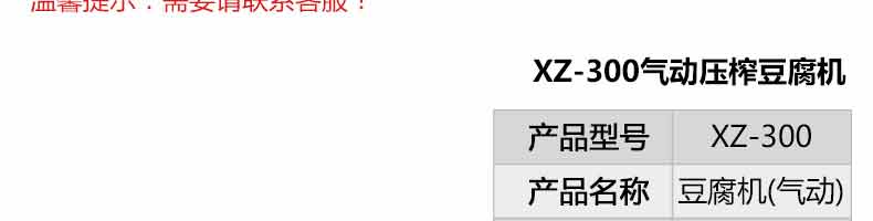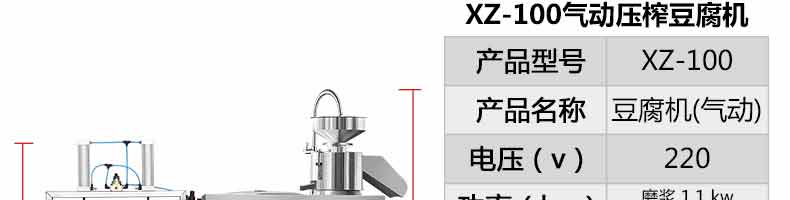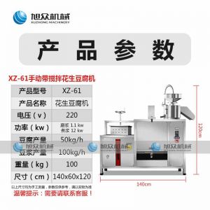 名稱xz-61手動帶攪拌花生豆腐機 電源220V 功率磨漿1.1KW,煮漿12KW 產(chǎn)量豆腐產(chǎn)量50KG/H,豆?jié){產(chǎn)量100KG/H 尺寸尺寸140*60*120mm 重量重量100KG 規(guī)格 其他