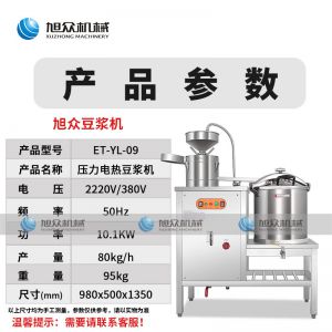 ET-YL-09壓力電熱豆?jié){機(jī),多功能商用豆?jié){機(jī),細(xì)、香、濃。我們珍惜每一顆大豆,讓每顆大豆進(jìn)發(fā)營養(yǎng)價(jià)值。旭眾豆?jié){機(jī)做您的招牌豆?jié){打磨細(xì)膩、口感香濃、回味無窮。