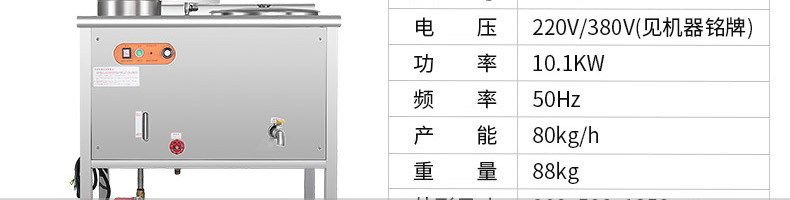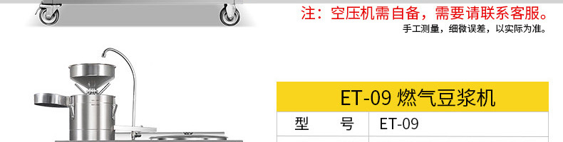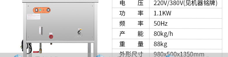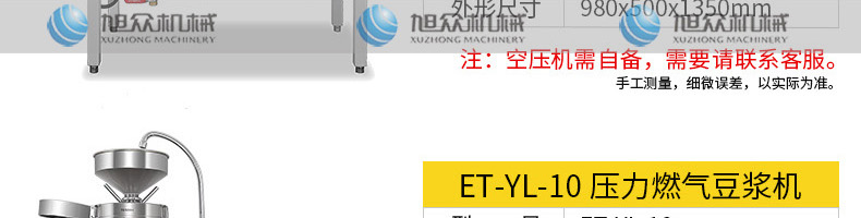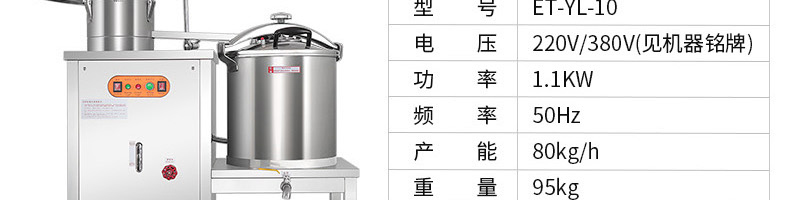 名稱ET-YL-09壓力電熱豆?jié){機(jī) 電源220V/380V 功率10.1KW 產(chǎn)量80kg/h 尺寸980X500X1350mm 重量95kg 規(guī)格聯(lián)系銷售員 其他頻率:50Hz