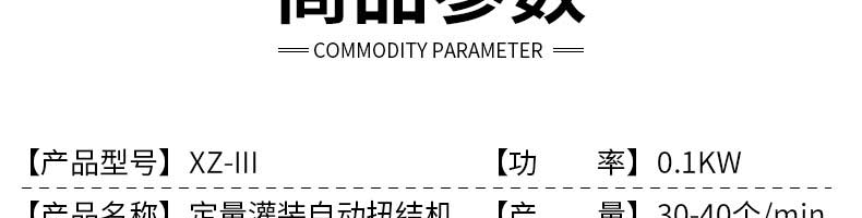 名稱XZ-III定量灌裝自動扭結(jié)機 電源220V 功率0.1KW 產(chǎn)量30-40個/min 尺寸700×800×1600mm 重量165kg 規(guī)格50g-1000g 其他【料斗容量】23/63升(標配23L)