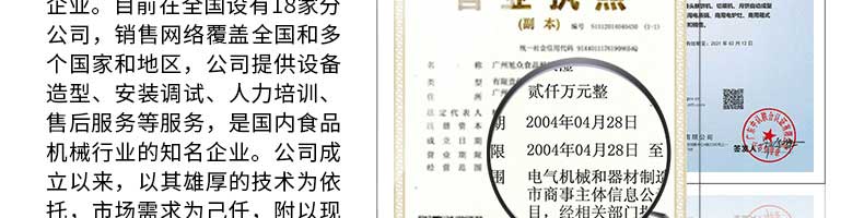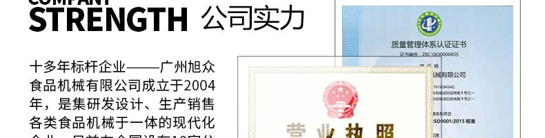 廣州旭眾食品機械有限公司是一家集科研開發(fā),生產(chǎn)設(shè)計,營銷服務(wù)為一體的現(xiàn)代化生產(chǎn)企業(yè)?,F(xiàn)代化生產(chǎn)車間,精湛制造技術(shù),所產(chǎn)機械歷經(jīng)市場重重考驗,不斷贏得海內(nèi)外客戶的贊譽。