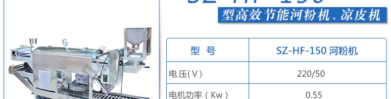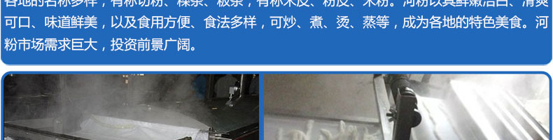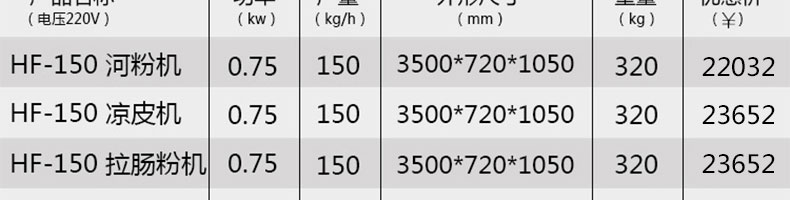 名稱SZ-HF-150高效節(jié)能河粉機 電源220/380V 功率0.75/41kw 產(chǎn)量60/90/120/150kg/h 尺寸主機尺寸3500*720*1050mm 外形尺寸3600*920*1500mm 重量320kg 規(guī)格粉條寬度mm:4/6/8/10 其他
