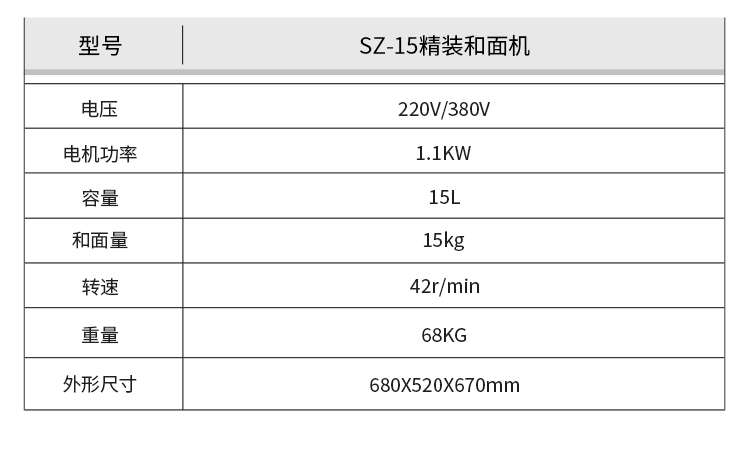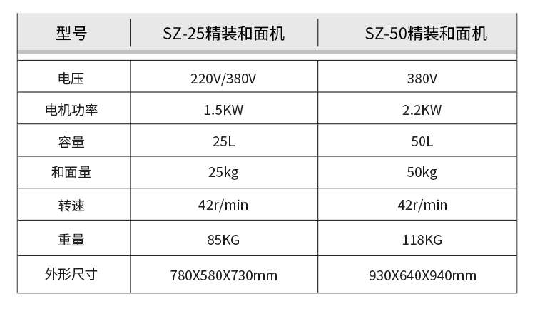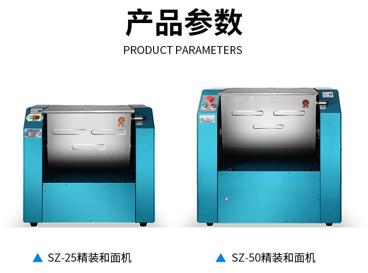 名稱(chēng)SZ-25精裝和面機(jī) 電源220V/380V 功率電機(jī)功率1.5KW 產(chǎn)量和面量25kg 尺寸780X580X730mm 重量85KG 規(guī)格容量25L、轉(zhuǎn)速42r/min 其他