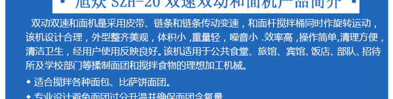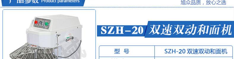 SZH-20型雙速雙動(dòng)和面機(jī),本機(jī)適合攪拌各種面包、包子、饅頭、湯圓、披薩餅面團(tuán),專業(yè)設(shè)計(jì)避免面團(tuán)過(guò)分升溫并確保面團(tuán)含氧量。過(guò)載、缺相保護(hù)裝置,防護(hù)罩安全連動(dòng)裝置。