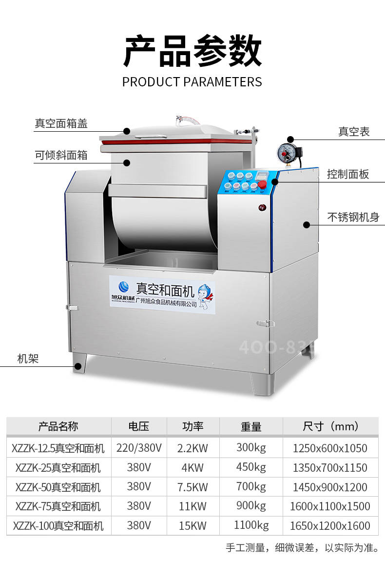 XZZK-25真空和面機,商用真空和面機,操作簡單、大容量、和面快、面團筋道。在真空狀態(tài)下模擬手工和面的原理,和面過程在真空負壓下拌和,使面粉中的蛋白質在短時間內、充分的吸收水分,使面筋網絡快速形成。