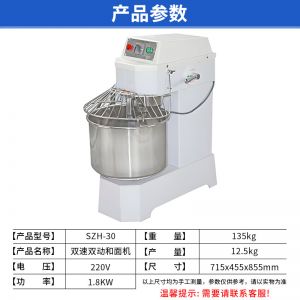 名稱SZH-30型雙速雙動和面機(jī) 電源220/380V 功率1.8kw 產(chǎn)量 尺寸外形尺寸715*455*855mm 重量135kg 規(guī)格 其他
