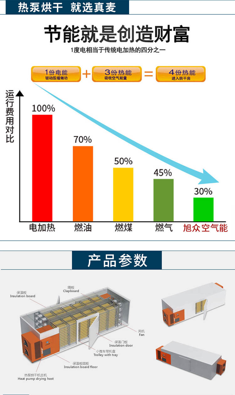 名稱030S-T-KD06空氣能烘干機(jī) 電源380v 功率6kw 產(chǎn)量9kw 尺寸1675X860x1280 重量180kg 規(guī)格2800X2200X2200mm 其他
