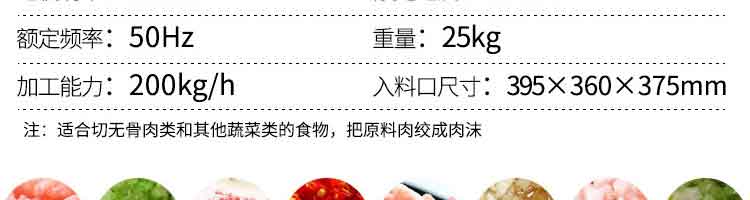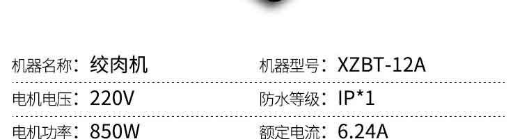 名稱XZBT-12A絞肉機(jī) 電源220V 功率850W 產(chǎn)量 尺寸395×360×375mm 重量25kg 規(guī)格 其他