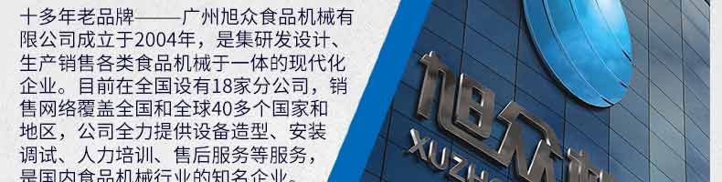 廣州旭眾食品機械有限公司是一家集科研開發(fā),生產(chǎn)設(shè)計,營銷服務(wù)為一體的現(xiàn)代化生產(chǎn)企業(yè)。現(xiàn)代化生產(chǎn)車間,精湛制造技術(shù),所產(chǎn)機械歷經(jīng)市場重重考驗,不斷贏得海內(nèi)外客戶的贊譽。