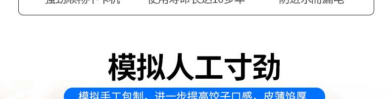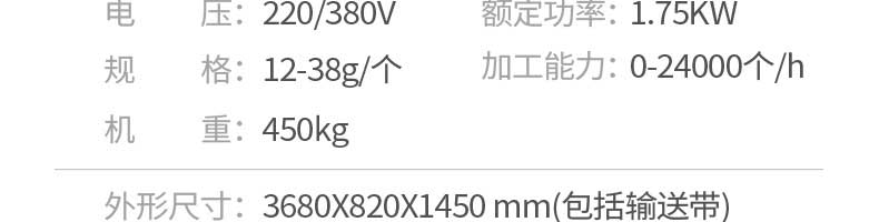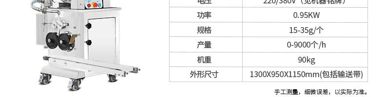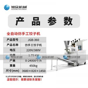 名稱JGB-360仿手工餃子機(jī) 電源220/380v 功率1.75kw 產(chǎn)量0-24000個(gè)/h 尺寸3680*820*1450mm 重量450kg 規(guī)格12-38g/個(gè) 其他