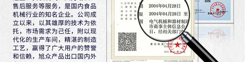 廣州旭眾食品機(jī)械有限公司是一家集科研開(kāi)發(fā),生產(chǎn)設(shè)計(jì),營(yíng)銷服務(wù)為一體的現(xiàn)代化生產(chǎn)企業(yè)?,F(xiàn)代化生產(chǎn)車間,精湛制造技術(shù),所產(chǎn)機(jī)械歷經(jīng)市場(chǎng)重重考驗(yàn),不斷贏得海內(nèi)外客戶的贊譽(yù)。