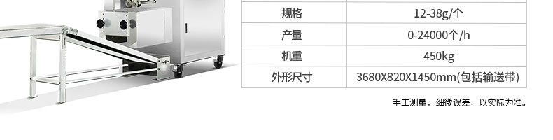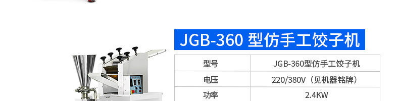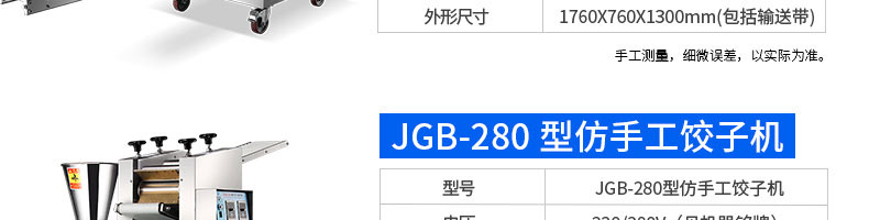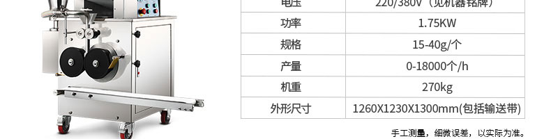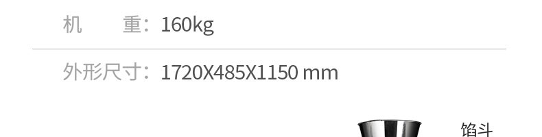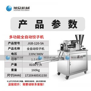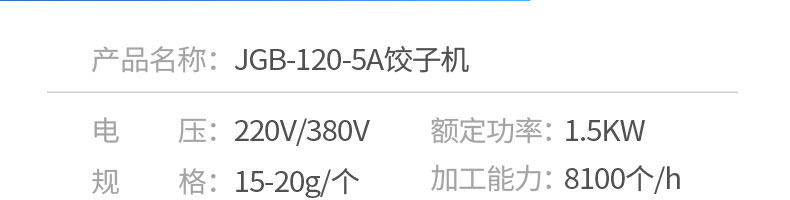名稱120-5A餃子機 電源220/380v 功率1.5kw 產(chǎn)量8100個/h 尺寸1720*485*1150mm 重量160kg 規(guī)格15-20g/個 其他