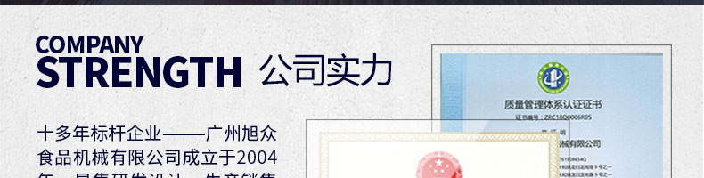 廣州旭眾食品機械有限公司是一家集科研開發(fā),生產(chǎn)設(shè)計,營銷服務(wù)為一體的現(xiàn)代化生產(chǎn)企業(yè)。現(xiàn)代化生產(chǎn)車間,精湛制造技術(shù),所產(chǎn)機械歷經(jīng)市場重重考驗,不斷贏得海內(nèi)外客戶的贊譽。
