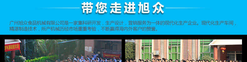 廣州旭眾食品機(jī)械有限公司是一家集科研開發(fā),生產(chǎn)設(shè)計(jì),營銷服務(wù)為一體的現(xiàn)代化生產(chǎn)企業(yè)?,F(xiàn)代化生產(chǎn)車間,精湛制造技術(shù),所產(chǎn)機(jī)械歷經(jīng)市場(chǎng)重重考驗(yàn),不斷贏得海內(nèi)外客戶的贊譽(yù)。