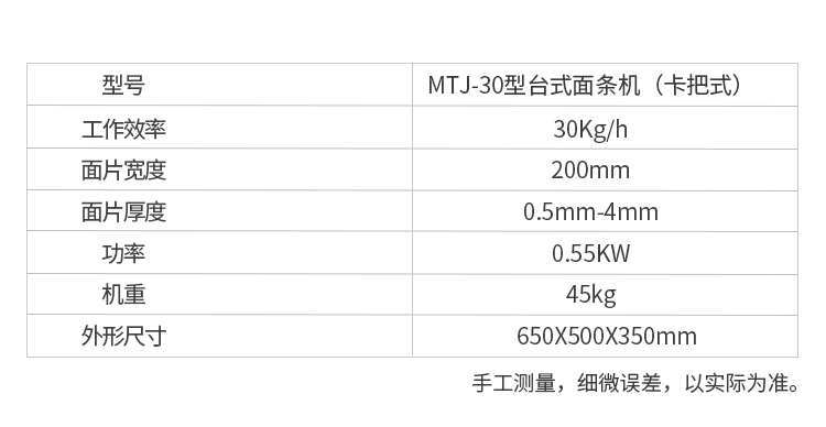 名稱MTJ-30型臺式面條機(卡把式) 電源 功率0.55KW 產(chǎn)量30kg/h 尺寸650X500X350mm 重量45k 規(guī)格面片寬度200mm面片厚度0.5mm-4mm 其他
