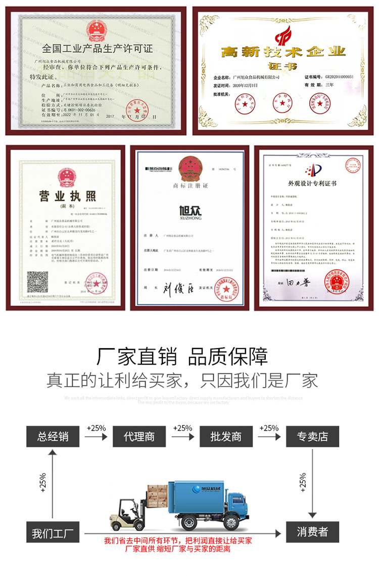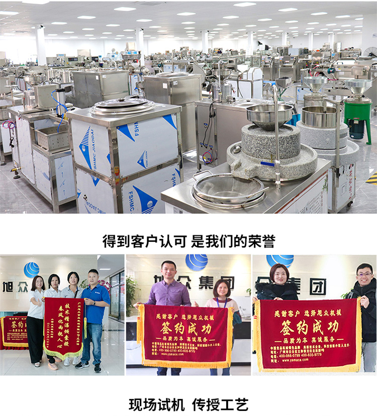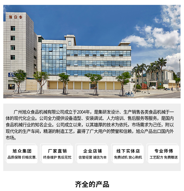廣州旭眾食品機械有限公司是一家集科研開發(fā),生產設計,營銷服務為一體的現(xiàn)代化生產企業(yè)?,F(xiàn)代化生產車間,精湛制造技術,所產機械歷經市場重重考驗,不斷贏得海內外客戶的贊譽。