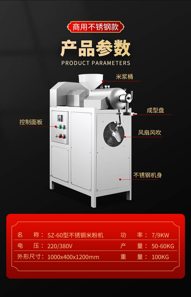 SZ-60不銹鋼米粉機,可生產(chǎn)米粉、米線、桂林米粉、過橋米線、年糕、糍粑等產(chǎn)品。各種形狀都可生產(chǎn)(圓、扁),加工食品外表光滑,厚薄、寬窄、粗細均勻可調(diào),筋軟適度,有彈性,口感柔軟、味道純正。