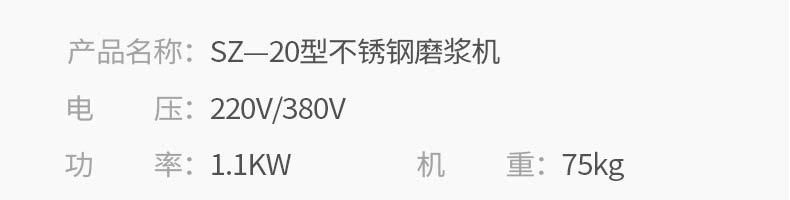名稱SZ-20不銹鋼磨漿機 電源220/380v 功率1.1kw 產(chǎn)量 尺寸607*350*1020mm 重量75kg 規(guī)格 其他