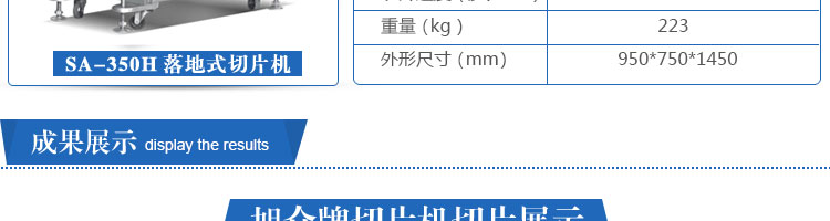 名稱SA-350H 全自動(dòng)落地式切片機(jī) 電源220 V 功率1.5kw 產(chǎn)量40轉(zhuǎn)/分鐘 尺寸950*750*1450?mm 重量 223 kg 規(guī)格 其他