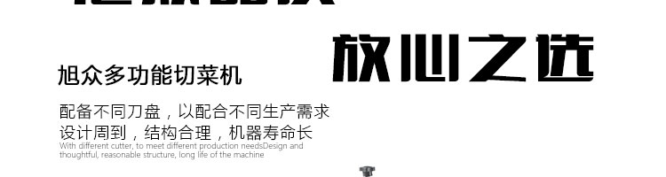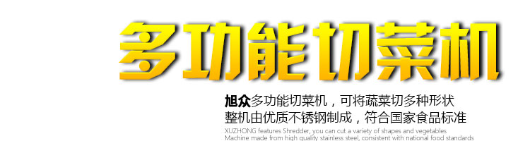 名稱XZ-682多功能切菜機 電源220/380V(見機器銘牌) 功率0.75kw 產(chǎn)量200-1000千克/小時 尺寸770*460*800mm 重量140kg 規(guī)格標配刀具尺寸:切絲:3mm,切片:3mm,切?。?0*10mm。可選的刀具尺寸:切絲:4、5、6mm 其他