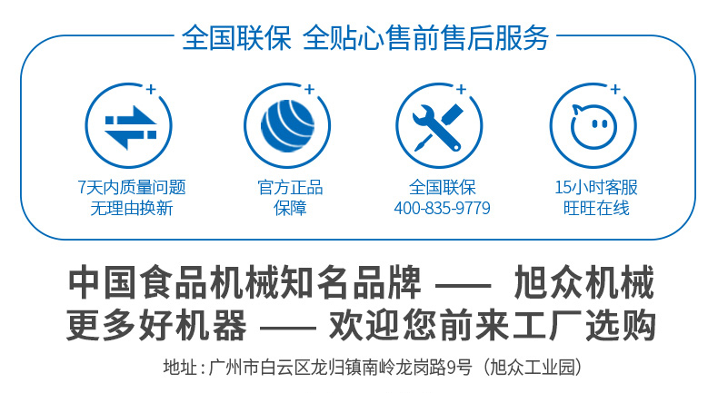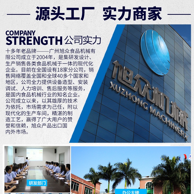 廣州旭眾食品機(jī)械有限公司是一家集科研開發(fā),生產(chǎn)設(shè)計,營銷服務(wù)為一體的現(xiàn)代化生產(chǎn)企業(yè)?,F(xiàn)代化生產(chǎn)車間,精湛制造技術(shù),所產(chǎn)機(jī)械歷經(jīng)市場重重考驗,不斷贏得海內(nèi)外客戶的贊譽(yù)。