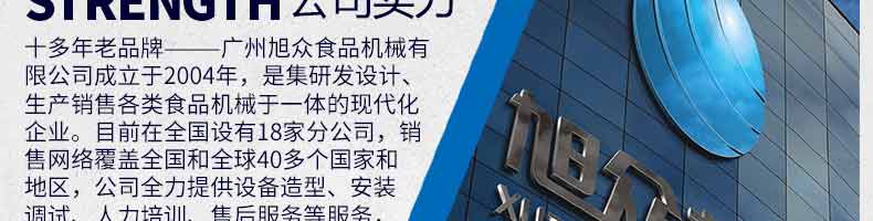 廣州旭眾食品機(jī)械有限公司是一家集科研開發(fā),生產(chǎn)設(shè)計,營銷服務(wù)為一體的現(xiàn)代化生產(chǎn)企業(yè)。現(xiàn)代化生產(chǎn)車間,精湛制造技術(shù),所產(chǎn)機(jī)械歷經(jīng)市場重重考驗,不斷贏得海內(nèi)外客戶的贊譽(yù)。