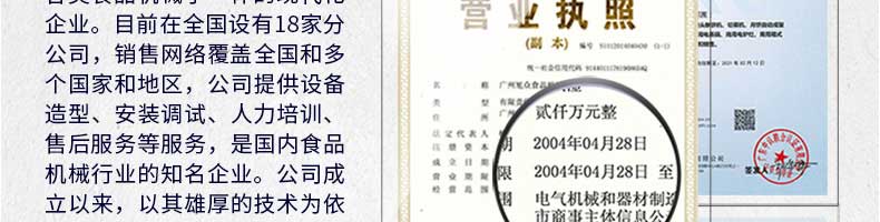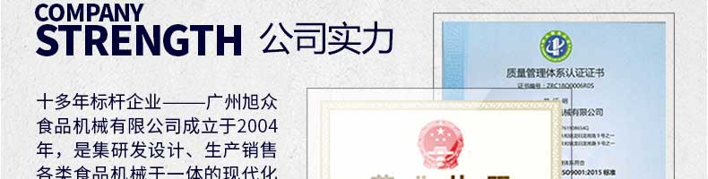 廣州旭眾食品機械有限公司是一家集科研開發(fā),生產(chǎn)設計,營銷服務為一體的現(xiàn)代化生產(chǎn)企業(yè)?,F(xiàn)代化生產(chǎn)車間,精湛制造技術,所產(chǎn)機械歷經(jīng)市場重重考驗,不斷贏得海內(nèi)外客戶的贊譽。