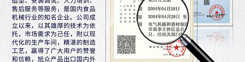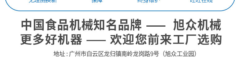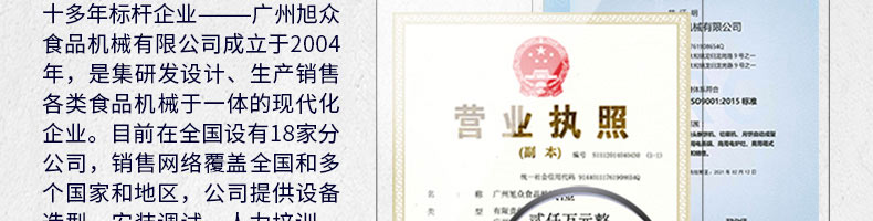 廣州旭眾食品機械有限公司是一家集科研開發(fā),生產(chǎn)設計,營銷服務為一體的現(xiàn)代化生產(chǎn)企業(yè)?,F(xiàn)代化生產(chǎn)車間,精湛制造技術(shù),所產(chǎn)機械歷經(jīng)市場重重考驗,不斷贏得海內(nèi)外客戶的贊譽。