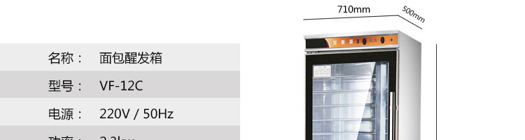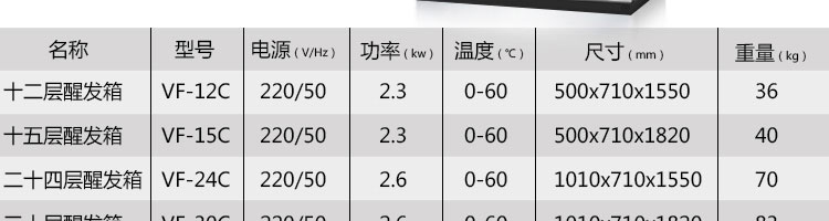 名稱VF多層面包醒發(fā)箱系列 電源220V/50Hz 220V/50Hz 220V/50Hz 220V/50Hz 功率2.3kw 2.3kw 2.6kw 2.6kw 產(chǎn)量 尺寸外形尺寸500*710*1550mm 500*710*1820mm 1010*710*1550mm 重量36kg 40kg 70kg 83kg 規(guī)格 其他