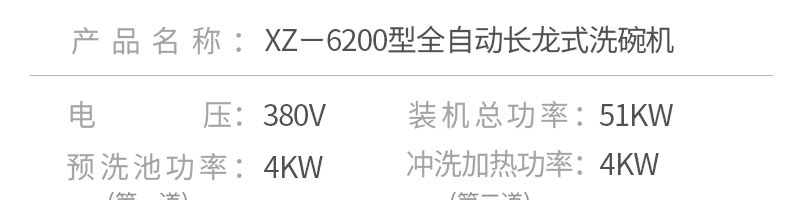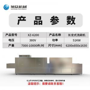 名稱(chēng)XZ-6200長(zhǎng)龍式洗碗機(jī) 電源380v 功率51kw 產(chǎn)量 尺寸6200*850*1630mm可訂制 重量 規(guī)格 其他