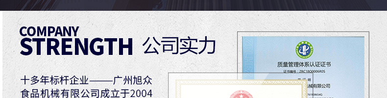 廣州旭眾食品機(jī)械有限公司是一家集科研開(kāi)發(fā),生產(chǎn)設(shè)計(jì),營(yíng)銷(xiāo)服務(wù)為一體的現(xiàn)代化生產(chǎn)企業(yè)?,F(xiàn)代化生產(chǎn)車(chē)間,精湛制造技術(shù),所產(chǎn)機(jī)械歷經(jīng)市場(chǎng)重重考驗(yàn),不斷贏(yíng)得海內(nèi)外客戶(hù)的贊譽(yù)。