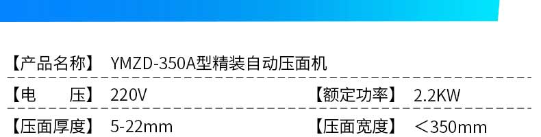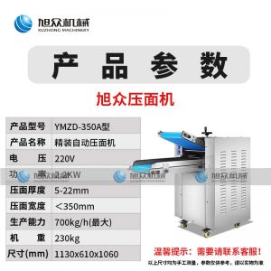 名稱YMZD-350A自動壓面 電源220V 功率2.2KW 產(chǎn)量700kg/h(最大) 尺寸1130×610×1060mn 重量230kg 規(guī)格【壓面厚度】5-22mm【壓面寬度】<350mm 其他