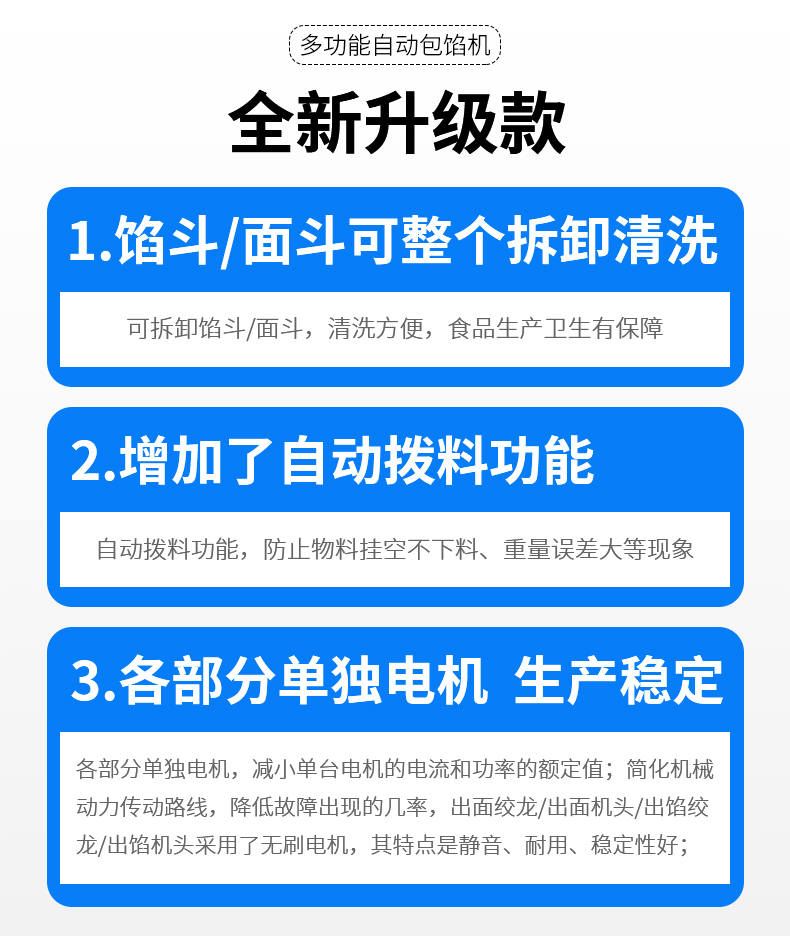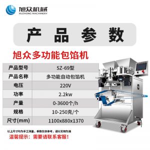 名稱SZ-69型多功能自動包餡機 電源220V 功率2.2KW 產(chǎn)量0-3600個/h 尺寸1100X880X1370mm 重量請咨詢銷售員 規(guī)格10-250克/個 其他