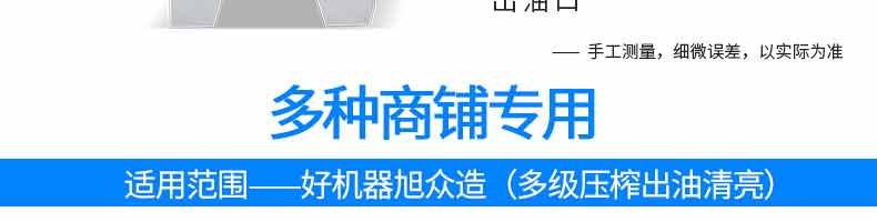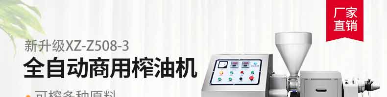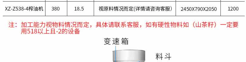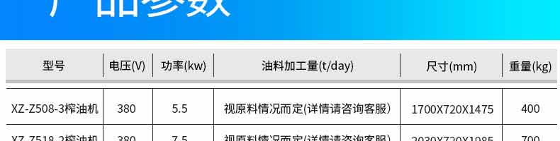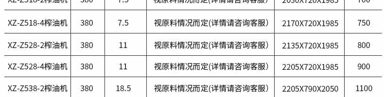 名稱XZ-Z508-3榨油機(jī) 電源380V 功率視型號(hào)而定7.5~18.5KW請(qǐng)下拉可查明細(xì) 產(chǎn)量視原料情況而定 尺寸視型號(hào)而定2030*720*1985mm~2450*790*2050mm請(qǐng)下拉可查明細(xì) 重量視型號(hào)而定700~1200KG請(qǐng)下拉可查明細(xì) 規(guī)格 其他