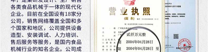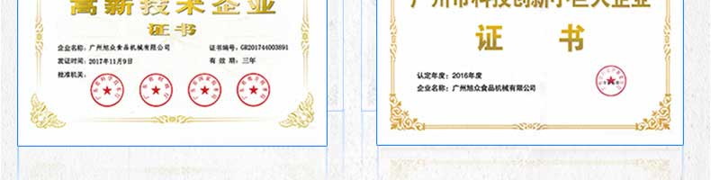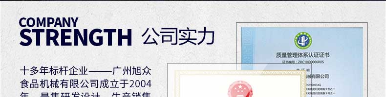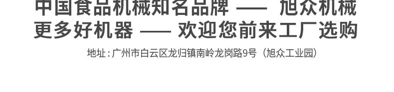廣州旭眾食品機(jī)械有限公司是一家集科研開發(fā),生產(chǎn)設(shè)計,營銷服務(wù)為一體的現(xiàn)代化生產(chǎn)企業(yè)?,F(xiàn)代化生產(chǎn)車間,精湛制造技術(shù),所產(chǎn)機(jī)械歷經(jīng)市場重重考驗(yàn),不斷贏得海內(nèi)外客戶的贊譽(yù)。